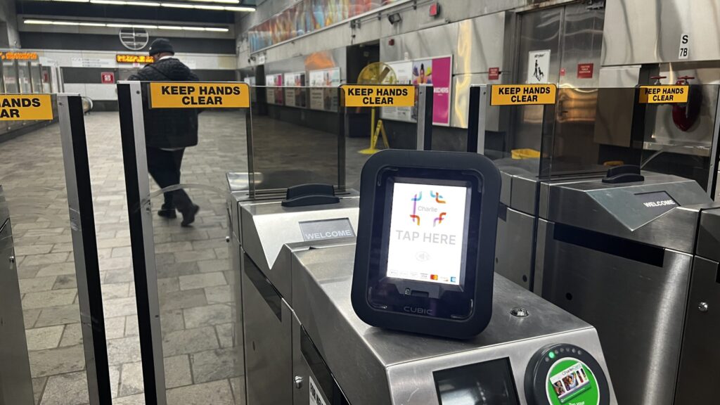 切符を買わなくてもクレジットカードやデビッドカードをTAP HEREと書かれた画面にかざすと乗れます。