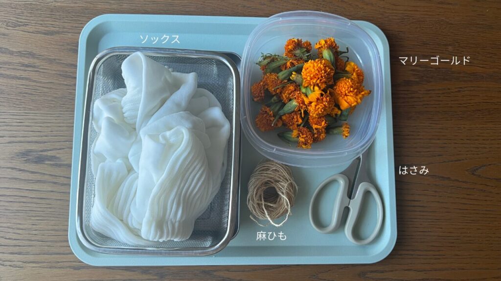 草木染の魅力は、思いどおりにならない偶然の美しさ。 自然と一緒に「どんな色になるかな?」と待つ時間も、楽しみのひとつです。本当はコスモスも染まりやすいそうなのですが今回は手に入れることができず、マリーゴールドのみで挑戦です
