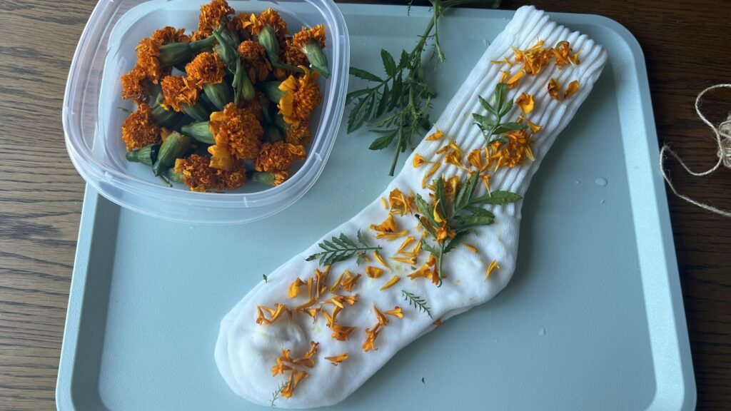 マリーゴールドで草木染(エコプリント)の紹介です。