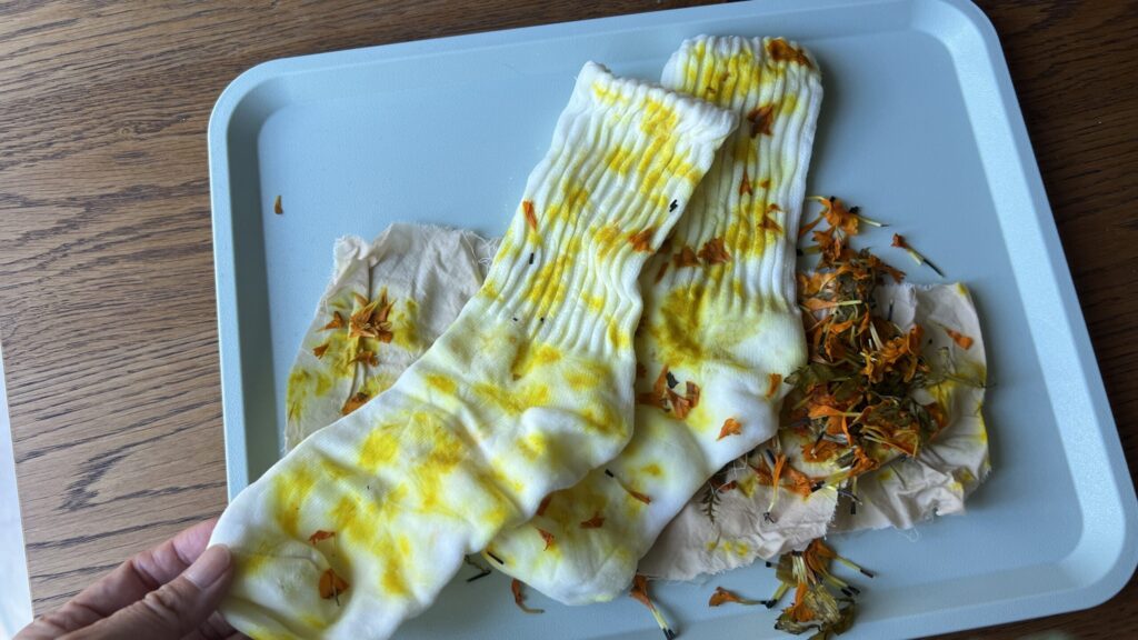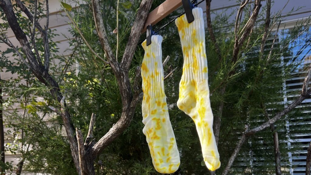 今回染めたマリーゴールドの靴下は、ふんわりとした黄色のグラデーションになりました。 左右で少しずつ違う色合いが出て、それもまた自然の作品のようです。たたき染めとかも楽しいのですが、その話はまた今後にします。