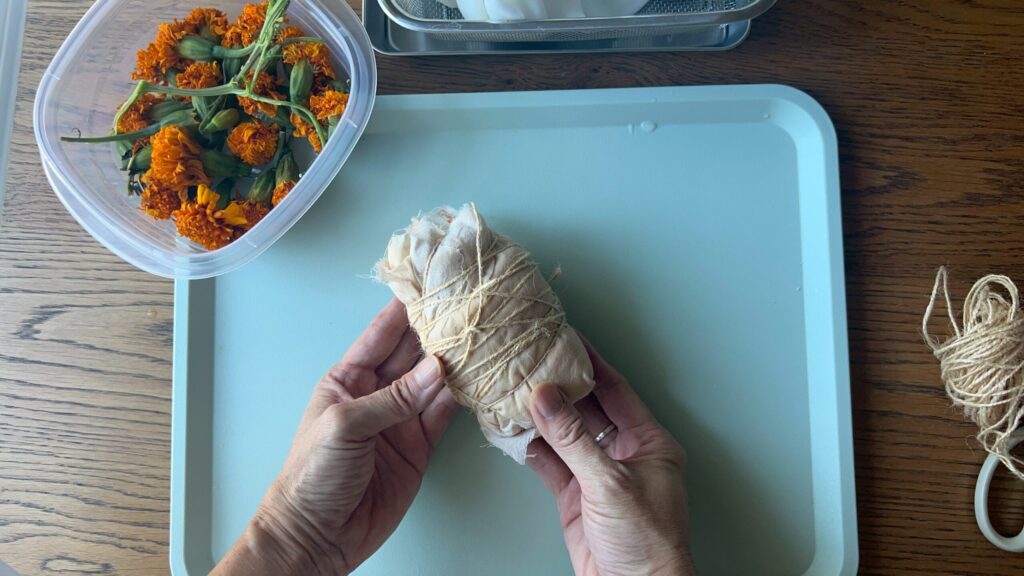 草木染は、植物がもつ自然の色素を布にうつす染め方です。 マリーゴールドには黄色やオレンジの色素が多く含まれ、明るくやわらかい色に染め上がります。 同じ花でも育った場所や乾燥具合によって発色が変わるのもおもしろいところ。