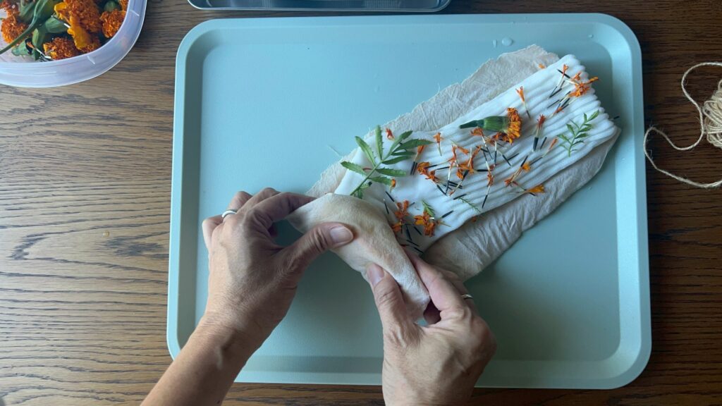 並べた花びらたちが動かないように薄い布もしくはクッキングシートでくるくる巻いていきます