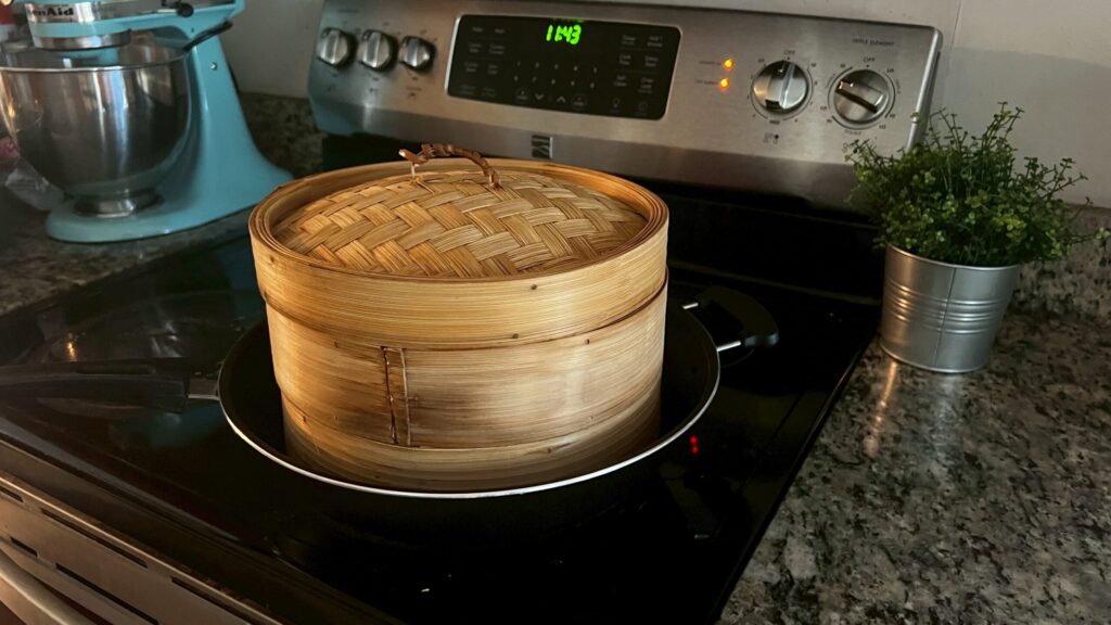 (蒸し器ないときは鍋の中にザルを入れて蒸せるようにしてください)
