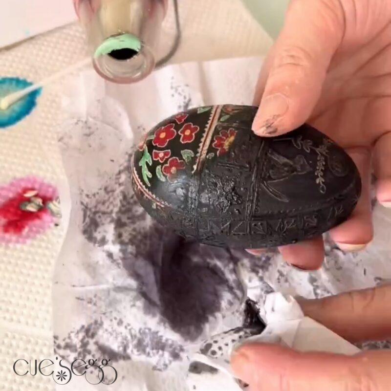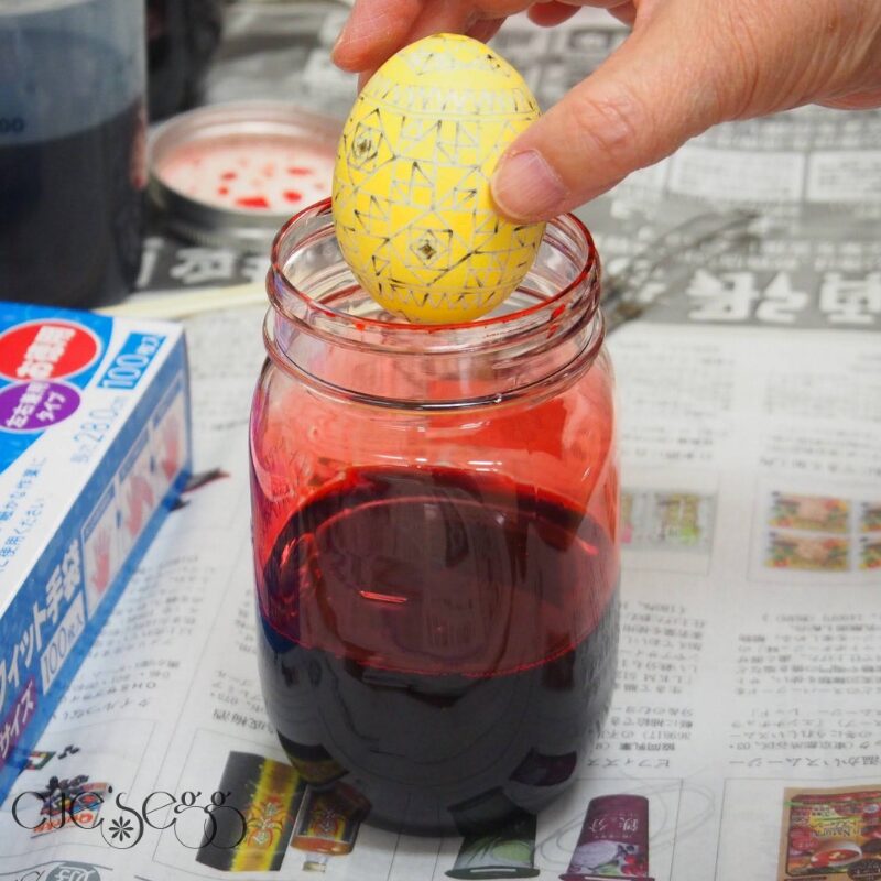 本物の卵の殻に、蜜蝋で模様を描いて染めて…を繰り返して作られるろうけつ染めという技法を使って作られています。