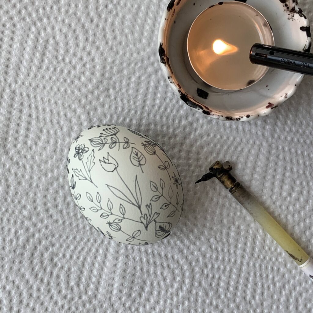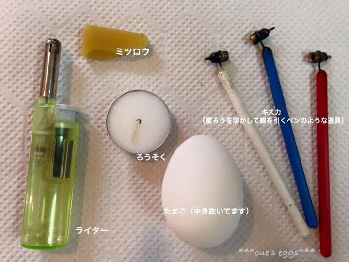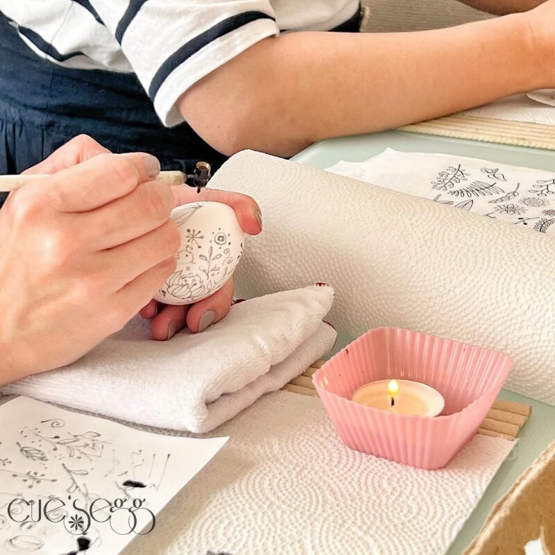 このキスカの先端をロウソクの火で温め、蜜ろうを熱しながら、蜜ろうをインク代わりに卵に線を引いていきます。