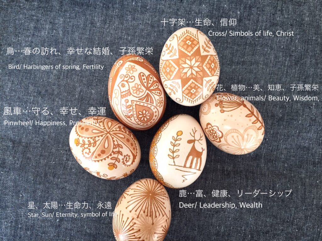 ただ美しいだけでなく、「願い」や「祈り」を込めて作られてきたピサンキは「悪いことを封じ、良いことを呼び込む」とされていたようで、昔の人達は家を建てたとき、子どもが生まれたときなどに「お守り」の意味を込めて様々な意味を持つ模様を組み合わせて、ピサンキを作って贈りあっていたそうです。